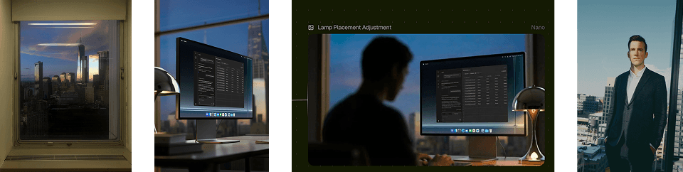 FLORA gave the creative team the ability to iterate on pre-visualization details before ever stepping on a real set. From wardrobe to environment to subtle finance references (a tennis ball on the bookshelf or specific watch details), every visual cue could be tested and locked before the real costs kicked in. This saved the team from time-consuming location scouting or unwanted production day surprises.