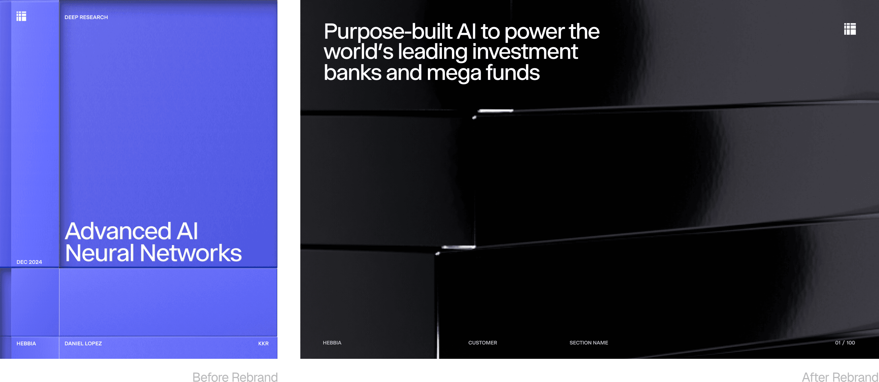 In July 2024, Hebbia closed a $130M Series B at a $700M valuation, making it one of the fastest-scaling AI companies in financial services. But their visual identity hadn't kept pace. As Hebbia moved upmarket, competing for seven-figure enterprise contracts and legacy incumbents, their brand needed to signal the same premium positioning as their product. “We need a brand that’s not only differentiated from competitors, but reflects that same love for craft and design that the finance world is infamous for " says Arjun Mahesh, Head of Design at Hebbia.